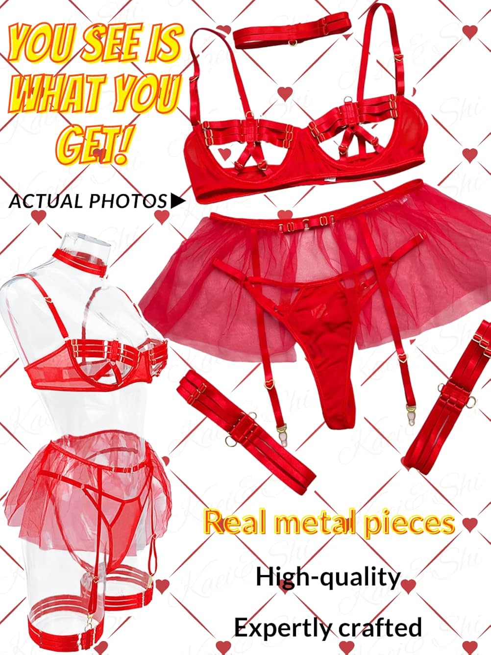 Kaei&Shi Strappy Bra, Tulle Skirt, HighWaisted Garter Belt, 4PC Choker Lingerie