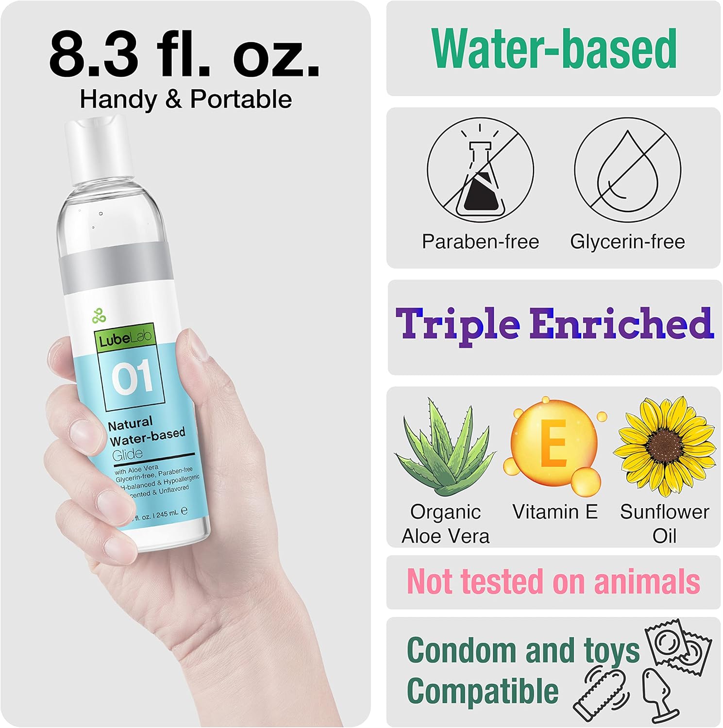 "✔ Water-based: This lubricant is a gentle water-based formula, enriched with organic aloe vera, Vitamin E, and sunflower oil, providing a longer-than-the-average glide. Non-staining and easy to wash off without sticky residue. Compatible with natural rubber latex and polyisoprene condoms, as well as toys.", "✔ Sensitive-skin Friendly: Free of glycerin, parabens, PEGs, drying alcohol, gluten, fragrance, flavors, harsh preservatives, animal products, and animal testing. It is colorless, unscented, unflavored, and 100% vegan.", "✔ pH-balanced: Carefully formulated to match the body's natural chemistry, this lubricant is pH-balanced and gentle on all skin types.", "✔ Developed in a USA Lab: Scientifically formulated by US experts in a California laboratory, and manufactured in an FDA-registered facility. Dermatologist-tested. American brand promises the highest quality product.", "✔ Discreet Packaging: We prioritize your privacy by using plain packaging for our products. Our knowledgeable staff is available to answer your questions promptly and professionally."