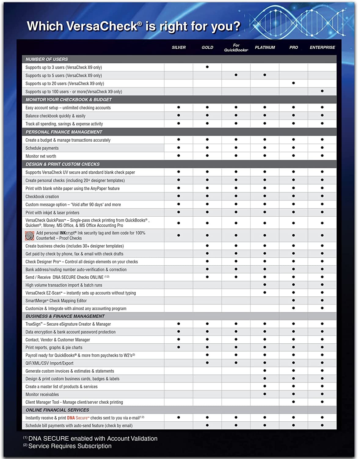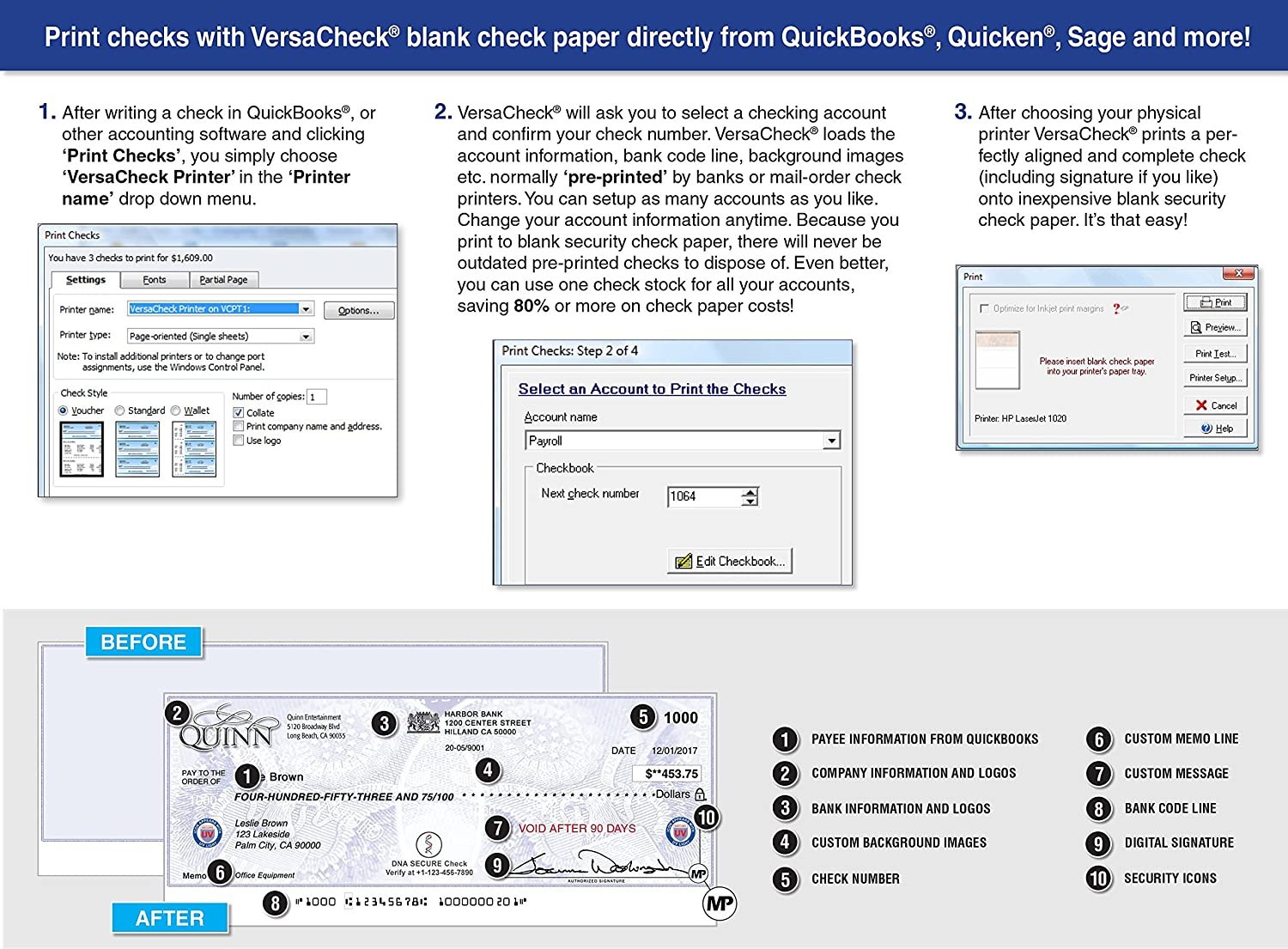 Includes VersaCheck Software Download, License for 100 Users, and 165 Print Validation codes. Additional print codes included FREE in VersaCheck Check Paper packaging.